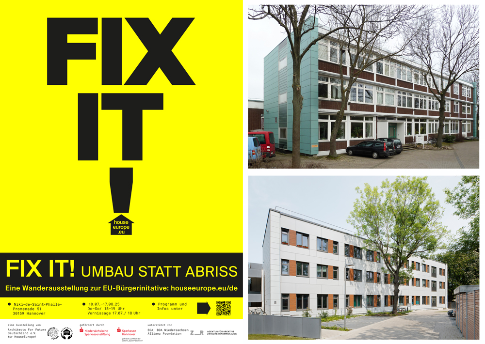 Im Rahmen der Wanderausstellung "FIX IT! Umbau statt Abriss" von Architects for Future und HouseEurope! ist unser Projekt Haus Miteinander vom 18.07. bis 17.08. in der Niki-de-Saint-Phalle-Promenade 51 zu sehen.