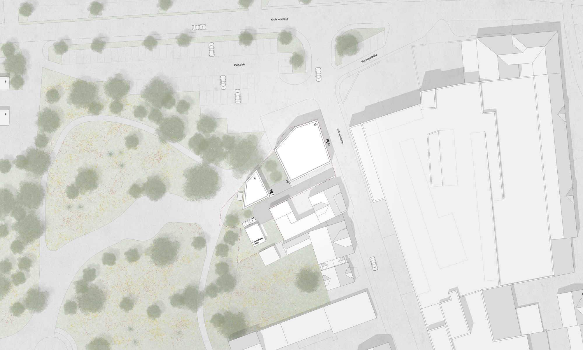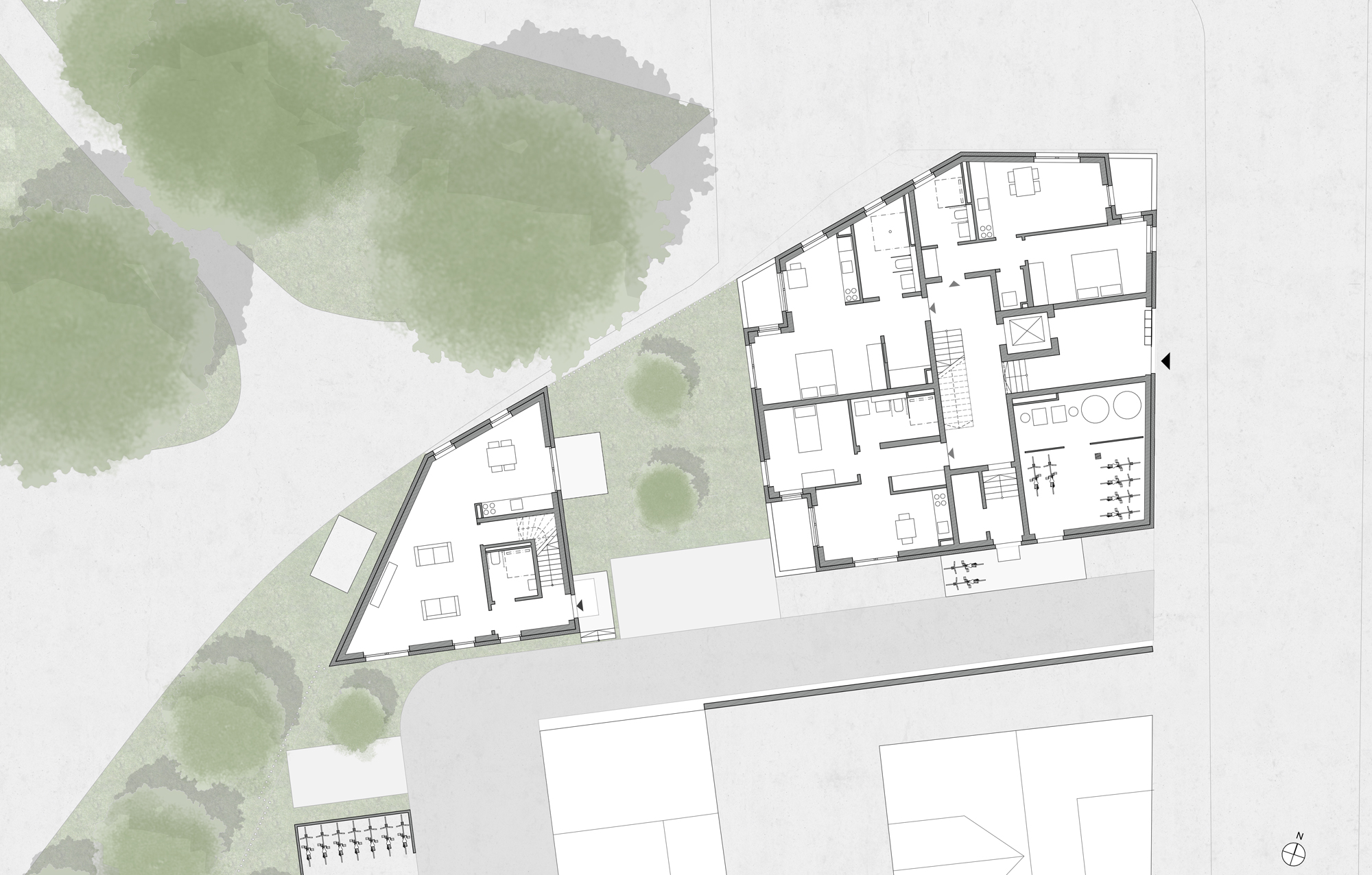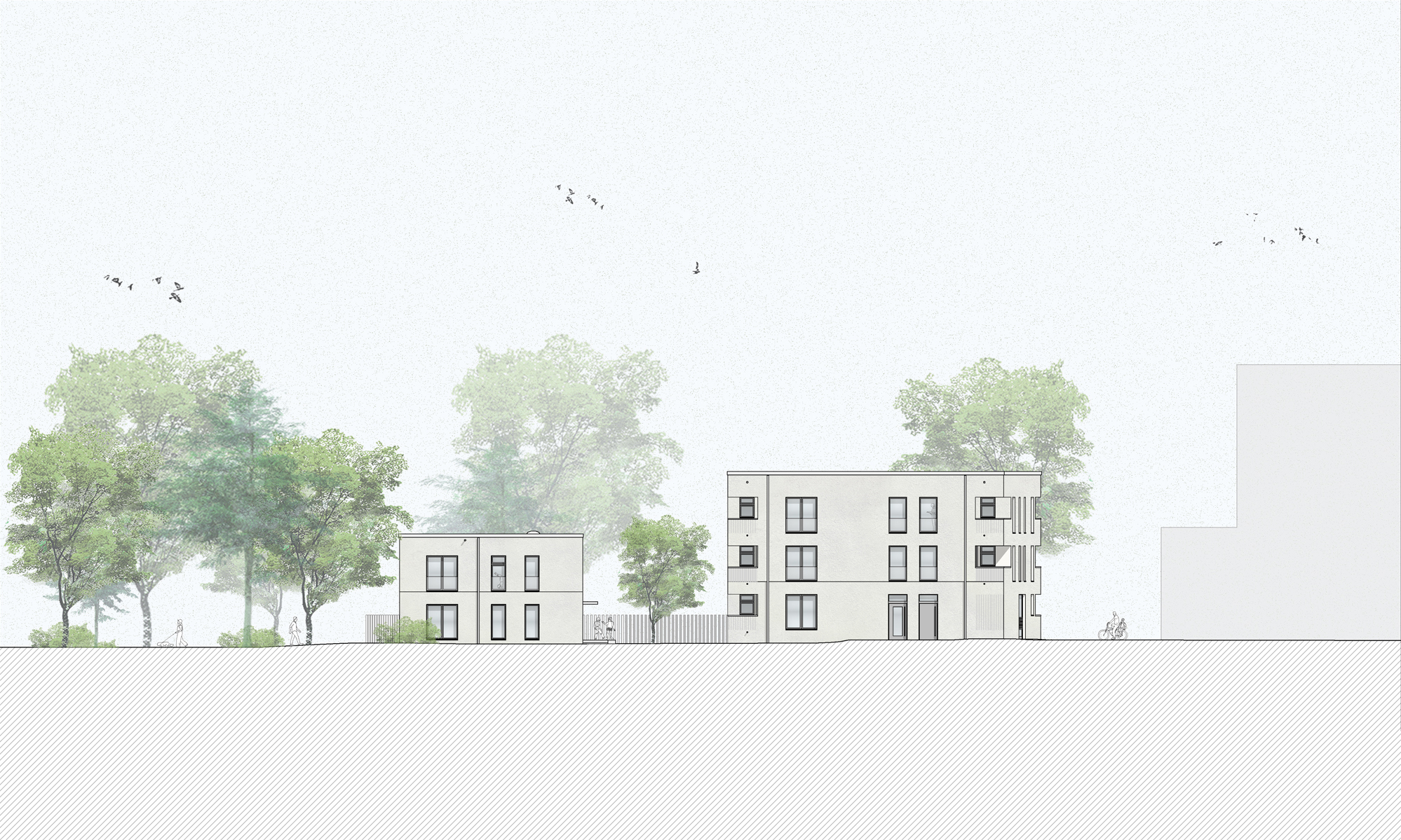 Das dreigeschossige Mehrfamilienhaus mit 11 Wohneinheiten positioniert sich markant auf der Ecke und schafft eine klare Abgrenzung von öffentlichem zu privatem Grund. In zweiter Reihe, zum Park ausgerichtet, ergänzt ein Einfamilienhaus das Ensemble. Es wird ein Wohnungsmix aus 1- bis 4-Zimmer- Wohnungen und Wohnungsgrößen von ca. 44 m2 bis ca. 120 m2 angeboten. Um die Privatsphäre der MieterInnen zu schützen, wird das Erdgeschoss als Hochparterre ausgeführt.